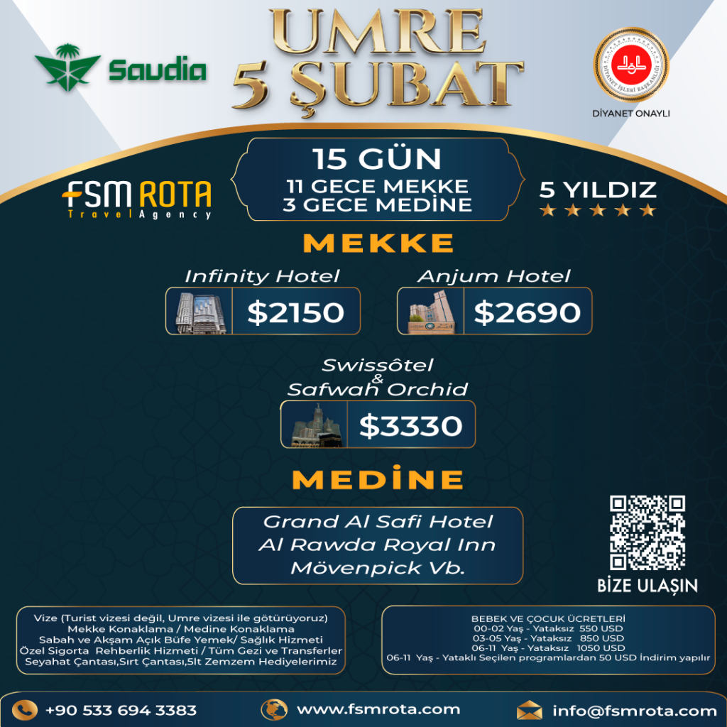 FSM Rota olarak, kutsal topraklara düzenlediğimiz Hac ve Umre turlarını en yüksek konforla sunuyoruz. Diyanet onaylı, sağlık sigortalı ve güvenli seyahat garantisiyle, bu mukaddes yolculuğunuzda hem manevi hem de fiziksel olarak rahat etmeniz için her detayı özenle planlıyoruz. Hac ve Umre turlarımızda deneyimli hocalarımız, ibadetlerinizi doğru ve huzurlu bir şekilde yerine getirmenize rehberlik ederken; profesyonel rehberlerimiz, mukaddes toprakları en iyi şekilde gezmenizi sağlıyor. Ulaşım, konaklama ve rehberlik gibi hizmetlerde sunduğumuz konfor ibadetlerinizi kolaylaştırıyor. FSM Rota'nın bu özel hizmetleriyle, Hac ve Umre’nin manevi zenginliğini en iyi şekilde deneyimleyin ve konforlu bir yolculuğun keyfini çıkarın. FSM Rota ile mukaddes topraklara yapacağınız bu anlamlı yolculuk için bize ulaşın ve kutsal deneyiminizi konforla buluşturun!