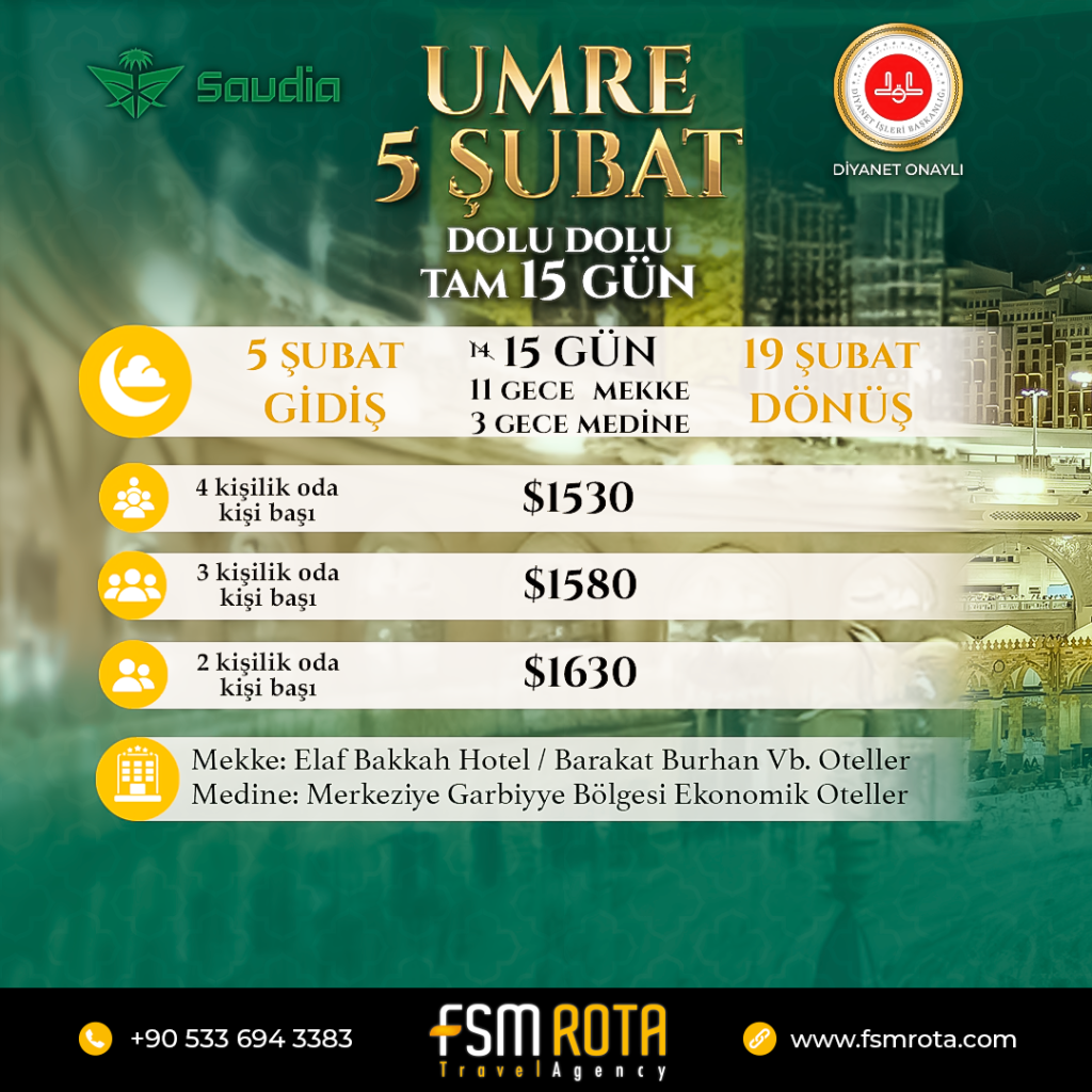 FSM Rota olarak, kutsal topraklara düzenlediğimiz Hac ve Umre turlarını en yüksek konforla sunuyoruz. Diyanet onaylı, sağlık sigortalı ve güvenli seyahat garantisiyle, bu mukaddes yolculuğunuzda hem manevi hem de fiziksel olarak rahat etmeniz için her detayı özenle planlıyoruz. Hac ve Umre turlarımızda deneyimli hocalarımız, ibadetlerinizi doğru ve huzurlu bir şekilde yerine getirmenize rehberlik ederken; profesyonel rehberlerimiz, mukaddes toprakları en iyi şekilde gezmenizi sağlıyor. Ulaşım, konaklama ve rehberlik gibi hizmetlerde sunduğumuz konfor ibadetlerinizi kolaylaştırıyor. FSM Rota'nın bu özel hizmetleriyle, Hac ve Umre’nin manevi zenginliğini en iyi şekilde deneyimleyin ve konforlu bir yolculuğun keyfini çıkarın. FSM Rota ile mukaddes topraklara yapacağınız bu anlamlı yolculuk için bize ulaşın ve kutsal deneyiminizi konforla buluşturun!